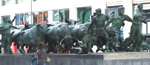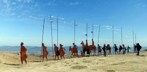 die eiserne Skulptur eines Pilgerzuges begrüßt. Die Skulptur wurde gestifte
