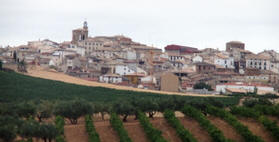 Vorort Cizur Menor auf einen eindrucksvollen Bergkamm zu.