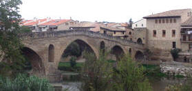 Nachdem Sie in der Klosterherberge mit Chorälen geweckt worden sind, passieren Sie bald im Wald ein uraltes Pilgerkreuz und es geht auf angenehmen Wegen hinunter nach Burguete (bask.: Auritz) und weiter über Espinal (bask.: Aurizbem), Bizkarreta-Gerendiain nach Lintzoain, wo dann der Aufstieg zum Erro-Pass (801 m) beginnt. Danach geht es auf steinigen Wegen teilweise steil bergab und wir kommen nach Zubiri (bask.: Esteribar) auf 526 m, wo eine alte Steinbrücke (Puente de la Rabia) den Rio Arga (ein Nebenfluss des Ebro) überquert. Dieser Fluß wird uns jetzt eine Weile begleiten und über die Dörfer Larrasoaña, Zuriáin, Iroz und Zabaldica kommen wir nach Villava (bask.: Atarrabia), wo eine Brücke beim Kloster Trinidad de Arre (mit schöner Pilgerherberge) wieder den Rio Arga überquert. Villava hat 10.000 Einwohner und wir befinden uns jetzt schon im Großraum Pamplona. Über den sich nahtlos anschliesenden Vorort Burlada sind wir bald in Pamplona und betreten die Stadt über die mittelalterliche Pilgerbücke "Puente Magdalena", die den Rio Arga überquert.