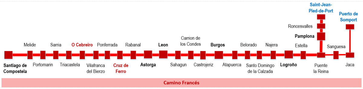 Der Camino Francés beginnt an den beiden Pyrenäenpässen von Ibañeta (Navarra) und Somport (Aragon). Diese zwei Stränge vereinigen sich bei Puente la Reina (Navarra). Von dort führt der Weg über Logroño, Burgos, León, Astorga und Sarria bis zum Ziel nach Santiago de Compostela. Der Weg ist auch als spanischer Fernwanderweg GR-65 markiert.