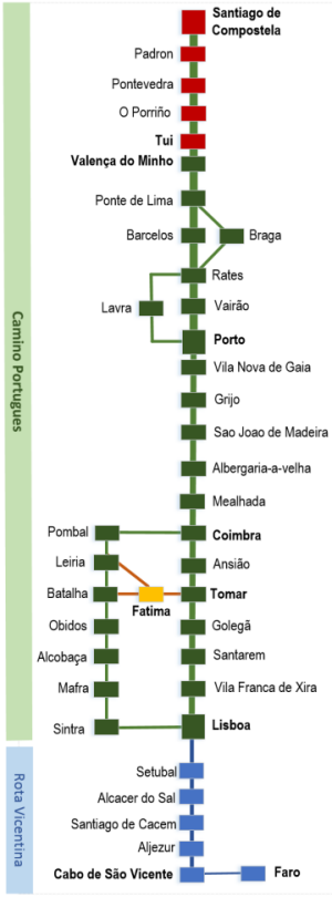 Die weiter im Landesinneren Portugals verlaufende Via Lusitana führt von der Algarve (Faro oder Vila Real de Santo António) im Süden Portugals kommend über Lamego, Chaves und das galicische Ourense nach Santiago de Compostela.