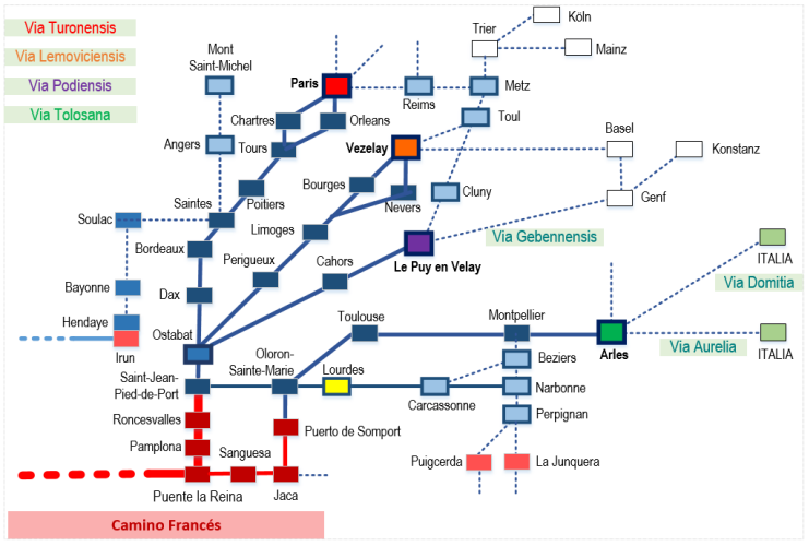Es gibt keinen eindeutigen historischen Jakobsweg, lediglich häufiger oder seltener gewählte Strecken. Die nachstehend beschriebene Hauptstrecke entspricht dem aktuell begangenen Weg, der als GR 653 gut markiert ist und entlang dem vielfältige Unterkunfts- und Verpflegungsmöglicheiten angeboten werden.