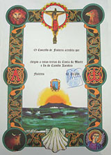 Ihnen nach Prüfung Ihres Credencials die Pilgerurkunde "Compostela"
