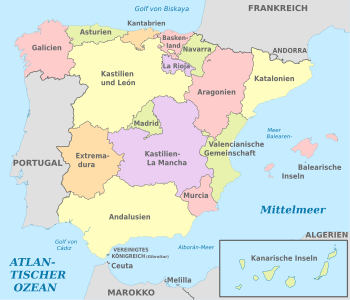 Die 17 Regionen Spaniens werden als autonome Gemeinschaften (Comunidades Autónomas) bezeichnet. Entsprechend der Verfassung von 1978 haben die autonomen Gemeinschaften durch Autonomiestatute bestimmte Kompetenzen deren Ausmaß dabei von Gemeinschaft zu Gemeinschaft variiert. Nach Bevölkerung die größten sind: Andalusien (8,0 Mio). Katalonien (7,2 Mio), Madrid (6,1 Mio) und Valencia (4,9 Mio),). Nach Fläche sind Castilla y Leon (94 Tsd. km²), Andalusien (87 Tsd. km²) und Castilla-La Mancha (79 km²). Die größeren der autonomen Gemeinschaften bestehen aus mehreren Provinzen - insgesamt gibt es 50 Provinzen. Die beiden Provinzen der Extremadura, Badajoz und Caceres sind nach Fläche die größten.
